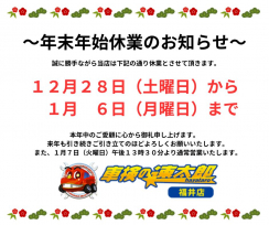 - 「車検の速太郎」福井店をご利用いただきまして誠に有難うございます!! 誠に勝手ながら 12月28日(土)~1月6日(月) までの期間、冬季休業とさせていただきます。 また、1/7は社員研修のため13:30からの営業となります。 休み中でも、ご予約はできますので、LIN...