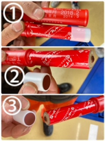 ➂白いキャップの茶色い部分と、発炎筒の先端の茶色い部分をマッチのように擦り合わせて点火します。