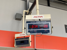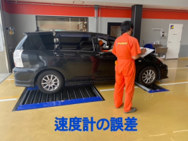 一つ目は、速度計の誤差です。最近のお車ですとFR車・RR車のお車は前後どちらかの片輪のみ、4WDの車は前輪・後輪どちらも検査します。同時に、メーターの針の振れとタイヤの振れを検査員が外で確認します。メーターの針が40㎞/hのところでリモコンのストップボタンを押し、誤差を確認します。