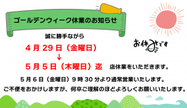 - 頃より当店をご利用頂き、誠にありがとうございます。 桜も散り始め、もうすぐゴールデンウイーク お車の調子はいかがでしょうか?タイヤ交換はお済みでしょうか?? 本日は、ゴールデンウイークの休業案内です。 当店は、4/27(土)~5/6(月)までお休みを頂きます。 ...