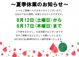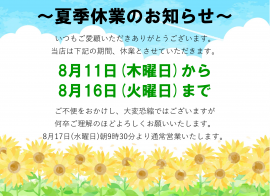 - いつもご愛顧いただき誠にありがとうございます! 誠に勝手ながら 8月11日(木)~8月16日(火)までの期間 夏季休業とさせていただきます なお、8月17日(水)午前9時30分より通常営業とさせていただきます。 ご不便をおかけして誠に申し訳ございませんが お車の急な...