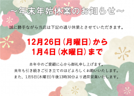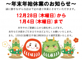 - いつも「車検の速太郎」福井店をご利用いただきまして誠にありがとうございます!! 誠に勝手ながら 12月28日(木)~1月4日(木) までの期間、年末年始休業とさせていただきます。 なお、1月5日(木)午後13時30分より通常営業とさせていただきます。 ご不便をおかけ...