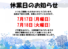 - いつも「車検の速太郎」福井店をご利用いただきまして誠にありがとうございます!! 休業日のお知らせです☀ 誠に勝手ながら 7月17日(月)・7月18日(火)の2日間休業とさせていただきます。 なお、7月19日(水)午前9:30分より通常営業とさせていただきます。 ご不便...