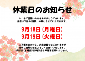- いつも「車検の速太郎」福井店をご利用いただきまして誠にありがとうございます!! 休業日のお知らせです☀ 誠に勝手ながら 9月18日(月)・9月19日(火)の2日間休業とさせていただきます。 なお、9月20日(水)午前9:30分より通常営業とさせていただきます。 ご不便...