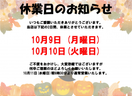 - いつも「車検の速太郎」福井店をご利用いただきまして誠にありがとうございます!! 休業日のお知らせです☀ 誠に勝手ながら 10月9日(月)・10月10日(火)の2日間休業とさせていただきます。 なお、10月11日(水)午前9:30分より通常営業とさせていただきます。 ご不...
