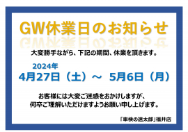 - 「車検の速太郎」福井店をご利用いただきまして誠にありがとうございます! 誠に勝手ながら 4月29日(金)~5月5日(木)までの期間、GW休業とさせていただきます。 なお、5月6日(金) 午前9:30より通常営業とさせていただきます。 ご不便をおかけして誠に申し訳ご...