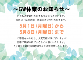 5月1日(月)~5月8日(月)までの期間、GW休業とさせていただきます。