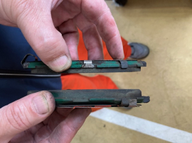 左のブレーキパッドは、左右でパッドの減り方が違います。これは、ブレーキクリーニングを作業することで防ぐことができます。ブレーキパッドの残量が少なくなると、ブレーキ部分から「キーキー」などという異音がします。