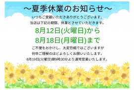8月12日(火)~8月18日(月)の7日間休業とさせていただきます。